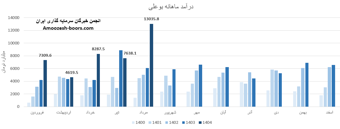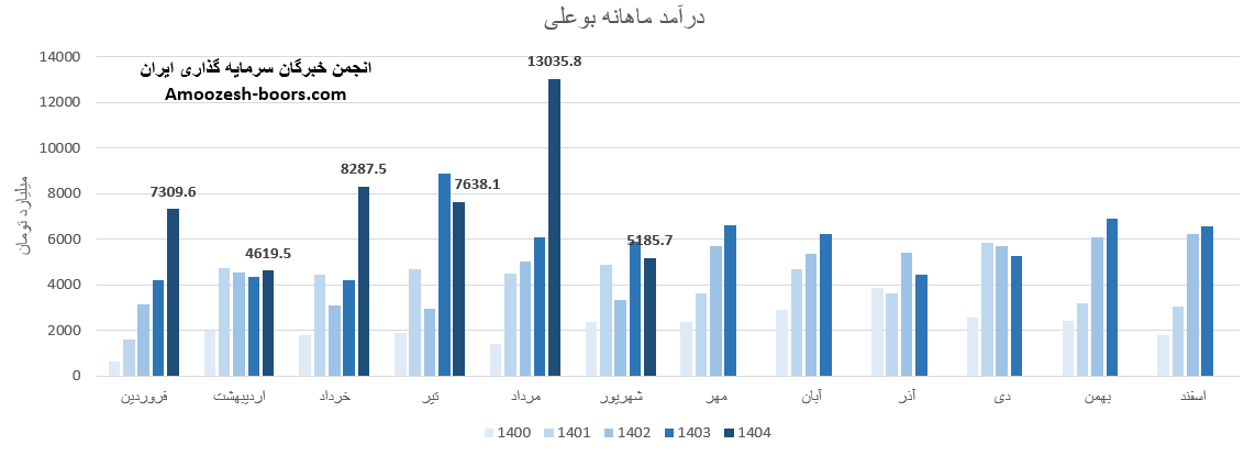 گزارش فعالیت ماهانه نماد بوعلی در خرداد ماه سال 1404 نشان میدهد که این شرکت در این بازه زمانی توانسته است به درآمد 8287.5 میلیارد تومان دست یابد، این رقم نسبت به ماه مشابه سال گذشته 97 درصد افزایش داشته است؛ همچنین در مقایسه با ماه گذشته و متوسط ماهانه به ترتیب تغییر 79+ و 39+ درصد داشته است.