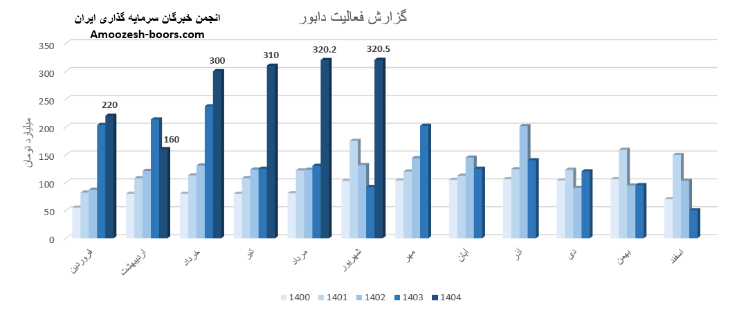 سهام دابور از ابتدای سال مالی تا پایان مرداد 1404، مجموع درآمد ثبت شده شرکت به 1310 میلیارد تومان رسیده که نسبت به مدت مشابه سال گذشته 44 درصد رشد داشته، و در همین حال 76 درصد از کل درآمد سال گذشته تحقق یافته است.