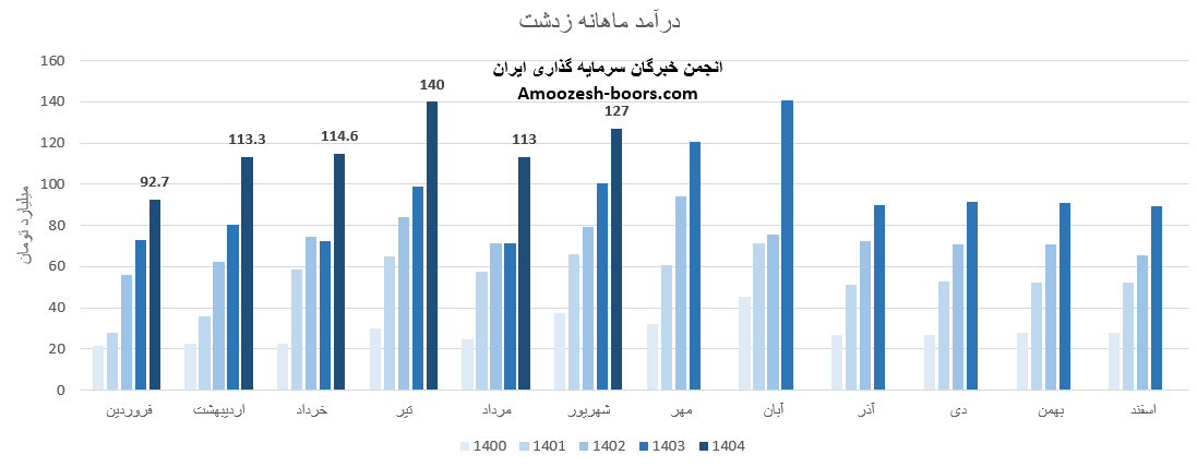سهام زدشت از ابتدای سال مالی تا پایان مرداد 1404، مجموع درآمد ثبت شده شرکت به 574 میلیارد تومان رسیده که نسبت به مدت مشابه سال گذشته 45 درصد رشد داشته، و در همین حال 51 درصد از کل درآمد سال گذشته تحقق یافته است.