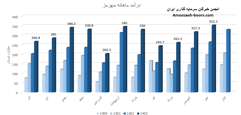 سهام سهرمز از ابتدای سال مالی تا پایان شهریور 1404، به درآمد 2922 میلیارد تومان رسیده که نسبت به مدت مشابه سال گذشته 39 درصد رشد داشته، و در همین حال 8 درصد بیشتر از کل درآمد سال گذشته تحقق یافته است.