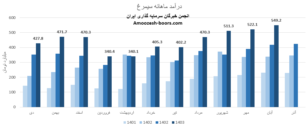بر اساس صورت مالی و عملکرد ماهانه سهام سیمرغ که در کدال منتشر شده، این شرکت در این ماه توانسته به درآمد 470 میلیارد تومان دست یابد، این عدد در مقایسه با ماه گذشته تغییر 17%+، در مقایسه با متوسط ماهانه 13%+ و در مقایسه با مدت مشابه 25%+ داشته است.