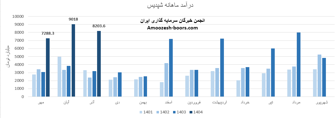 سهام شپدیس از ابتدای سال مالی تا پایان آذر 1404، به درآمد 24510 میلیارد تومان رسیده که نسبت به مدت مشابه سال گذشته 143 درصد رشد داشته، و در همین حال 44% از کل درآمد سال گذشته تحقق یافته است.