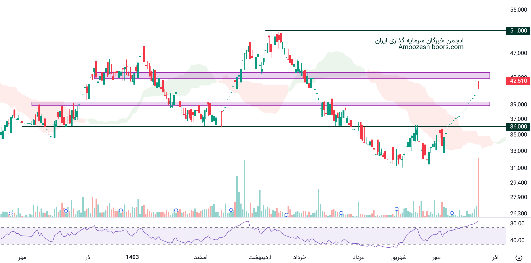 حمایت غدام 40000 ریال: این سطح بهعنوان یک نقطه حیاتی برای جلوگیری از اصلاح بیشتر قیمت عمل میکند، اگر قیمت به زیر این سطح نفوذ کند، انتظار میرود که حمایت بعدی در محدوده 34000 ریال قرار داشته باشد.