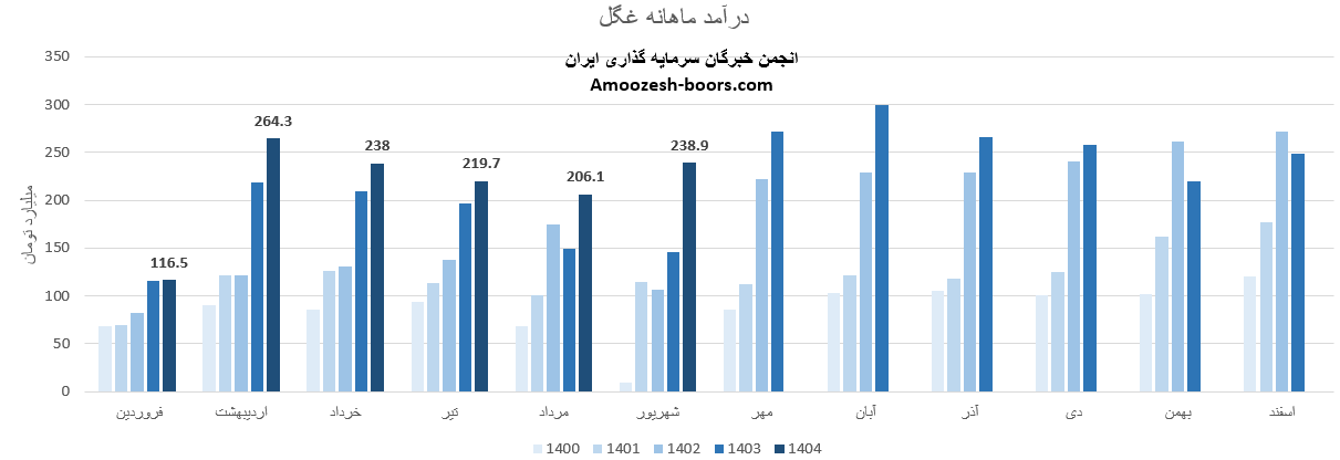 سهام غگل از ابتدای سال مالی تا پایان مرداد 1404، مجموع درآمد ثبت شده شرکت به 1044 میلیارد تومان رسیده که نسبت به مدت مشابه سال گذشته 17 درصد رشد داشته، و در همین حال 40 درصد از کل درآمد سال گذشته تحقق یافته است.