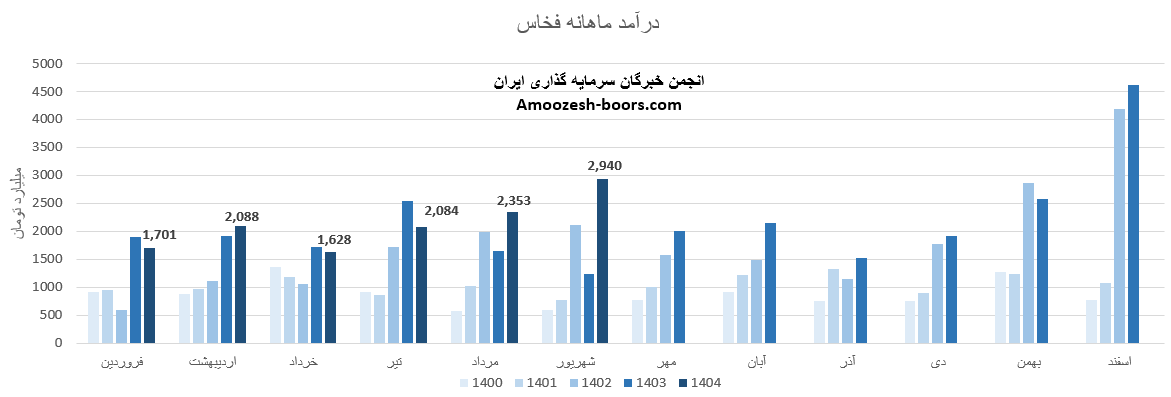 گزارش فعالیت ماهانه نماد فخاس در خرداد ماه سال 1404 نشان میدهد که این شرکت در این بازه زمانی توانسته است به درآمد 1628.5 میلیارد تومان دست یابد، این رقم نسبت به ماه مشابه سال گذشته 5 درصد کاهش داشته است؛ همچنین در مقایسه با ماه گذشته و متوسط ماهانه به ترتیب تغییر 22- و -14 درصد داشته است.