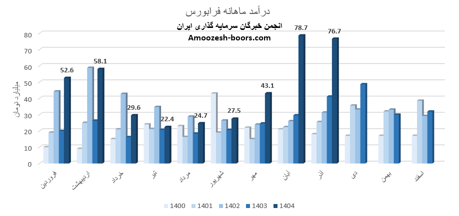 سهام فرابورس از ابتدای سال مالی تا پایان آذر 1404، به درآمد 413 میلیارد تومان رسیده که نسبت به مدت مشابه سال گذشته 90 درصد رشد داشته، و در همین حال 26% بیشتر از کل درآمد سال گذشته تحقق یافته است.