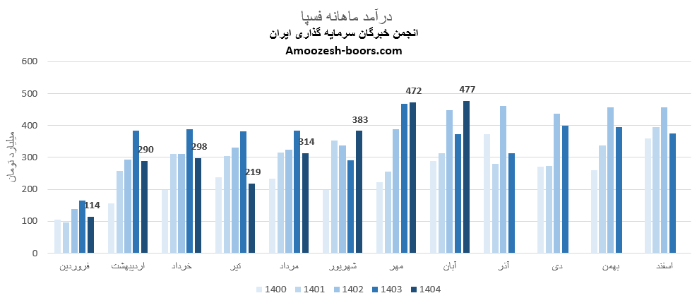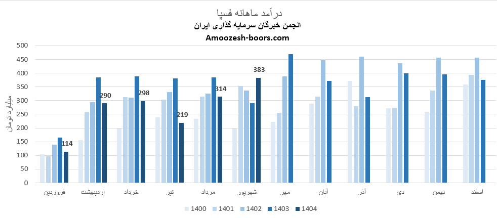 سهام فسپا از ابتدای سال مالی تا پایان مرداد 1404، مجموع درآمد ثبت شده شرکت به 1234 میلیارد تومان رسیده که نسبت به مدت مشابه سال گذشته 28 درصد افت داشته، و در همین حال 29 درصد از کل درآمد سال گذشته تحقق یافته است.