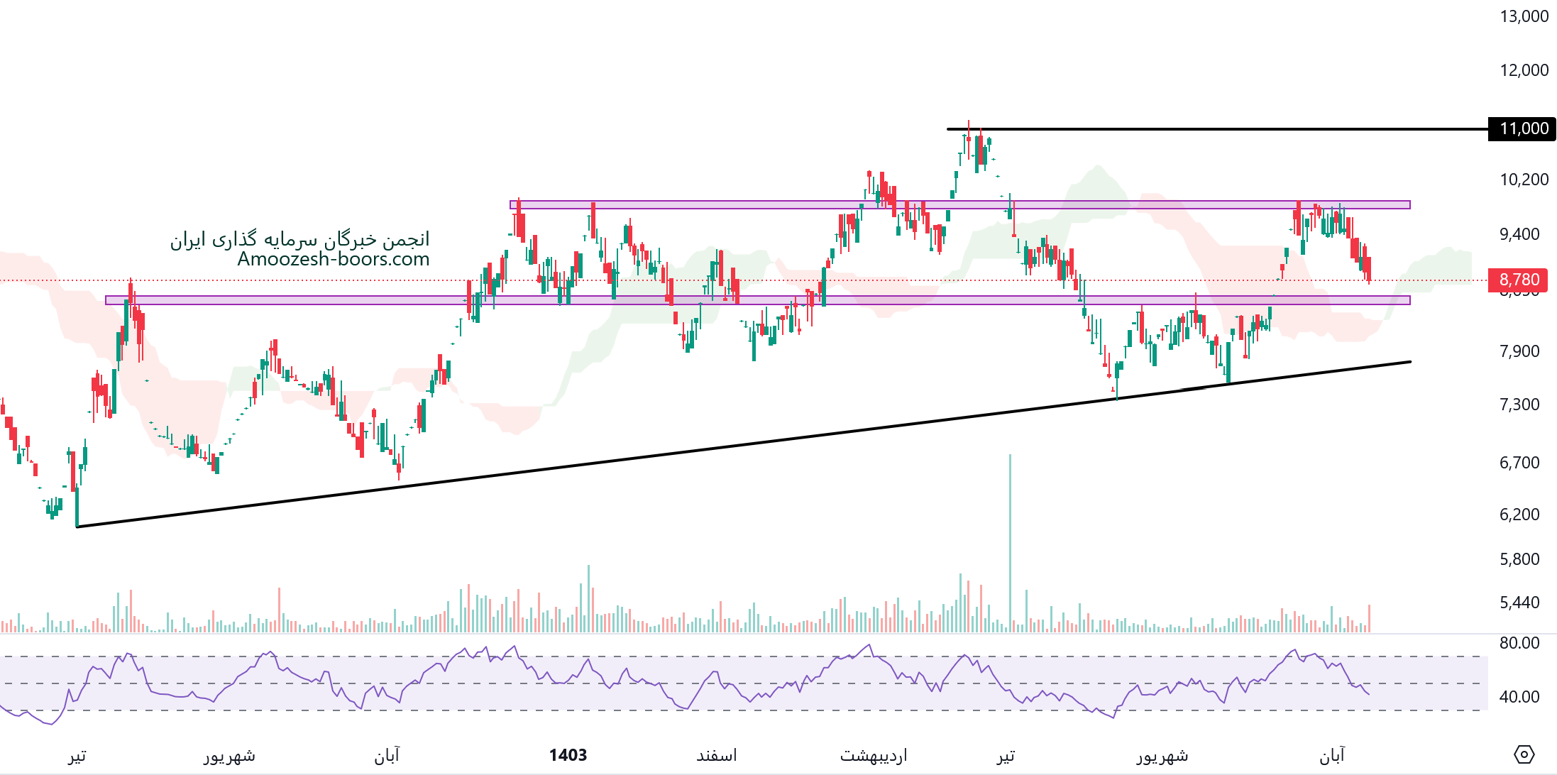 حمایت قشیر 8500 ریال: این سطح بهعنوان یک نقطه حیاتی برای جلوگیری از اصلاح بیشتر قیمت عمل میکند، اگر قیمت به زیر این سطح نفوذ کند، انتظار میرود که حمایت بعدی در محدوده 7400 ریال قرار داشته باشد.