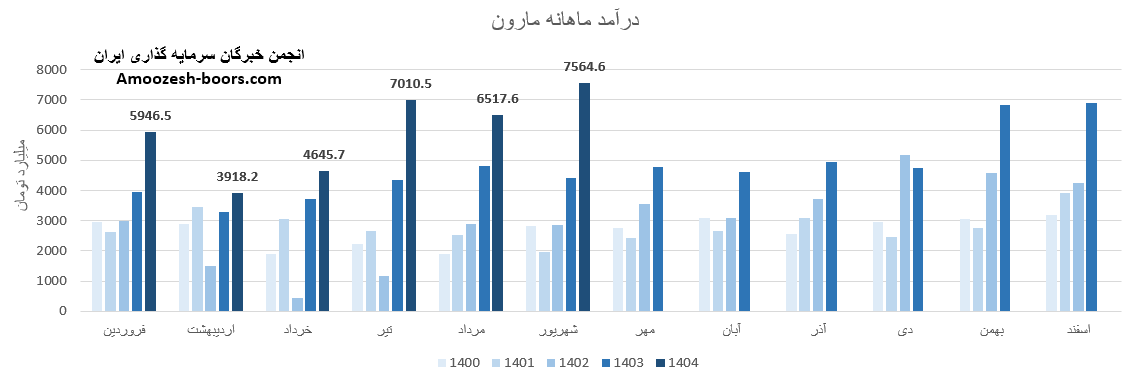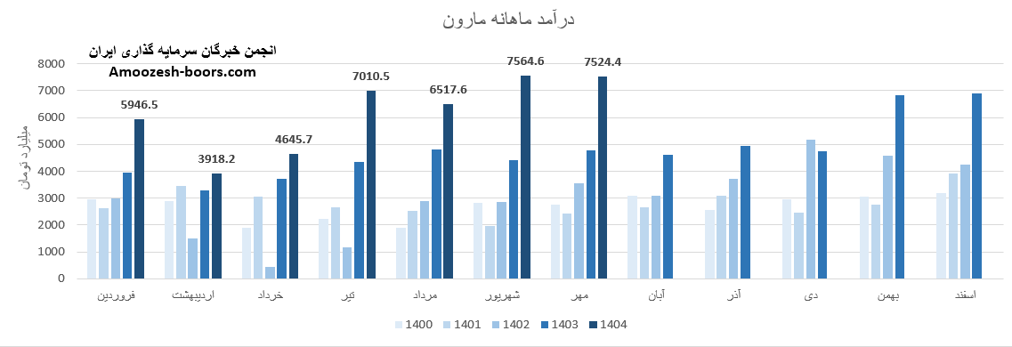 سهام مارون از ابتدای سال مالی تا پایان شهریور 1404، به درآمد 35603 میلیارد تومان رسیده که نسبت به مدت مشابه سال گذشته 45 درصد رشد داشته، و در همین حال 62 درصد از کل درآمد سال گذشته تحقق یافته است.