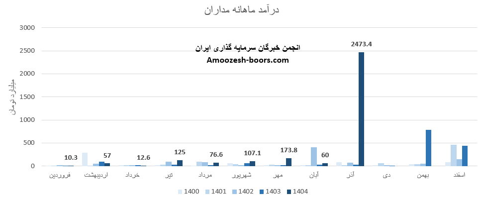سهام مداران از ابتدای سال مالی تا پایان آذر 1404، به درآمد 3096 میلیارد تومان رسیده که نسبت به مدت مشابه سال گذشته 903 درصد رشد داشته، و در همین حال 99% درصد بیشتر از کل درآمد سال گذشته تحقق یافته است.