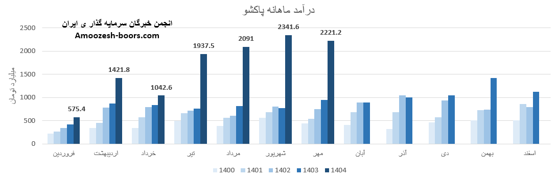 سهام پاکشو از ابتدای سال مالی تا پایان مرداد 1404، مجموع درآمد ثبت شده شرکت به 7068 میلیارد تومان رسیده که نسبت به مدت مشابه سال گذشته 91 درصد رشد داشته، و در همین حال 65 درصد از کل درآمد سال گذشته تحقق یافته است.