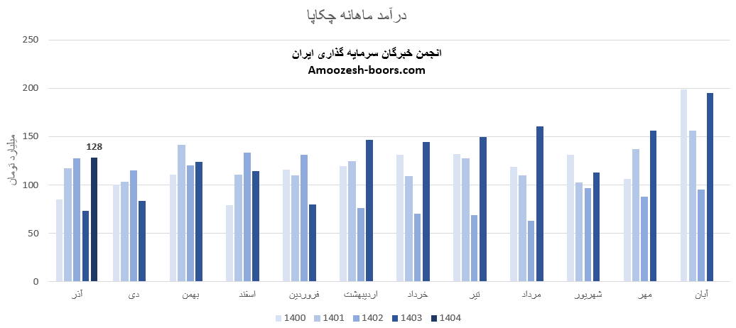 سهام چکاپا از ابتدای سال مالی تا پایان آذر 1404، به درآمد 128میلیارد تومان رسیده که نسبت به مدت مشابه سال گذشته 75 درصد رشد داشته، و در همین حال 8% از کل درآمد سال گذشته تحقق یافته است.