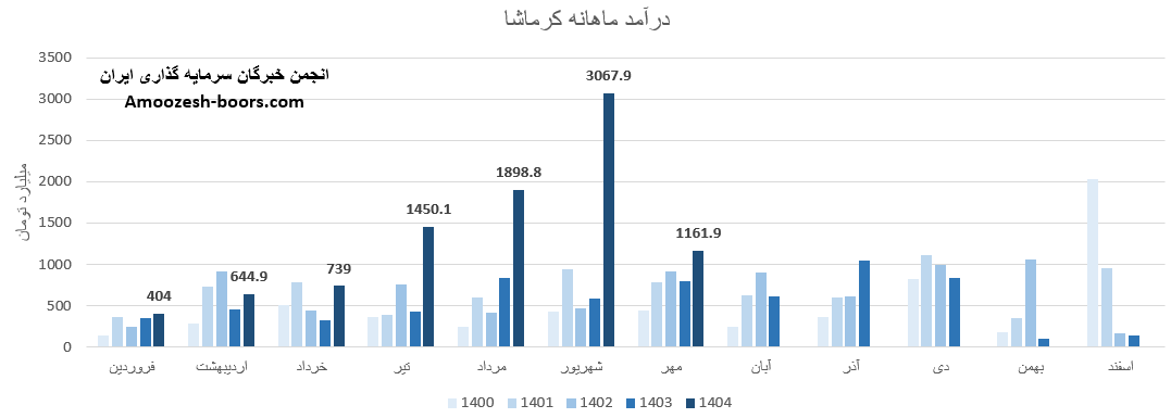 سهام کرماشا از ابتدای سال مالی تا پایان مرداد 1404، مجموع درآمد ثبت شده شرکت به 5137 میلیارد تومان رسیده که نسبت به مدت مشابه سال گذشته 116 درصد رشد داشته، و در همین حال 79 درصد از کل درآمد سال گذشته تحقق یافته است.