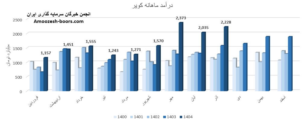 بر اساس گزارش فعالیت سهم کویر که در کدال منتشر شده، این شرکت در این ماه توانسته به درآمد 2228.3 میلیارد تومان دست یابد، این عدد در مقایسه با ماه گذشته تغییر 10%+، در مقایسه با متوسط ماهانه 41%+ و در مقایسه با مدت مشابه 42%+ داشته است.