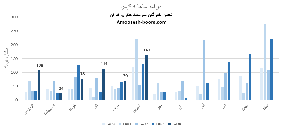 گزارش فعالیت ماهانه نماد کیمیا در اردیبهشت ماه سال 1404 نشان میدهد که این شرکت در این بازه زمانی توانسته است به درآمد 24.3 میلیارد تومان دست یابد، این رقم نسبت به ماه مشابه سال گذشته 5 درصد کاهش داشته است؛ همچنین در مقایسه با ماه گذشته تغییر 78- داشته است.