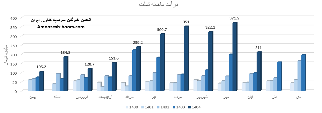 سهام تملت از ابتدای سال مالی تا پایان شهریور 1404، به درآمد 1786 میلیارد تومان رسیده که نسبت به مدت مشابه سال گذشته 100 درصد رشد داشته، و در همین حال 27 درصد بیشتر از کل درآمد سال گذشته تحقق یافته است.