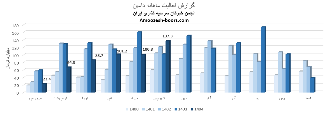 سهام دامین از ابتدای سال مالی تا پایان مرداد 1404، مجموع درآمد ثبت شده شرکت به 378 میلیارد تومان رسیده که نسبت به مدت مشابه سال گذشته 36 درصد افت داشته، و در همین حال 27 درصد از کل درآمد سال گذشته تحقق یافته است.
