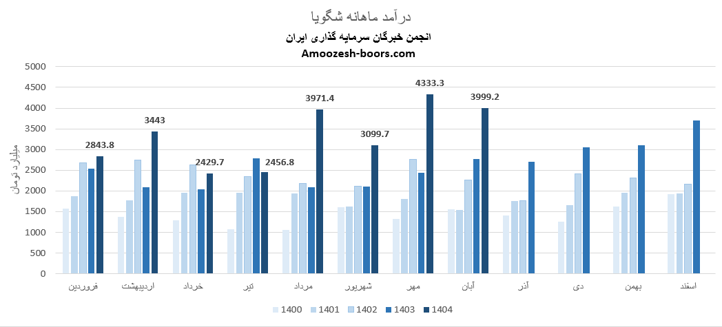 سهام شگویا از ابتدای سال مالی تا پایان مرداد 1404، مجموع درآمد ثبت شده شرکت به 15145 میلیارد تومان رسیده که نسبت به مدت مشابه سال گذشته 31 درصد رشد داشته، و در همین حال 48 درصد از کل درآمد سال گذشته تحقق یافته است.