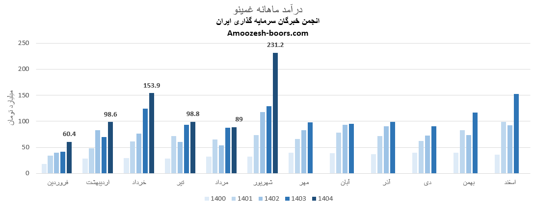 سهام غمینو از ابتدای سال مالی تا پایان مرداد 1404، مجموع درآمد ثبت شده شرکت به 500 میلیارد تومان رسیده که نسبت به مدت مشابه سال گذشته 20 درصد رشد داشته، و در همین حال 42 درصد از کل درآمد سال گذشته تحقق یافته است.