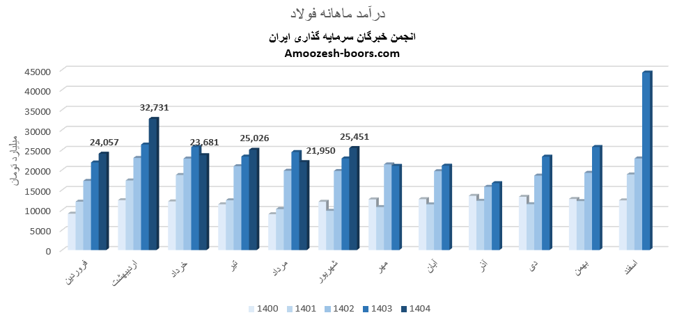 سهام فولاد از ابتدای سال مالی تا پایان مرداد 1404، مجموع درآمد ثبت شده شرکت به 127444 میلیارد تومان رسیده که نسبت به مدت مشابه سال گذشته 5 درصد رشد داشته، و در همین حال 43 درصد از کل درآمد سال گذشته تحقق یافته است.