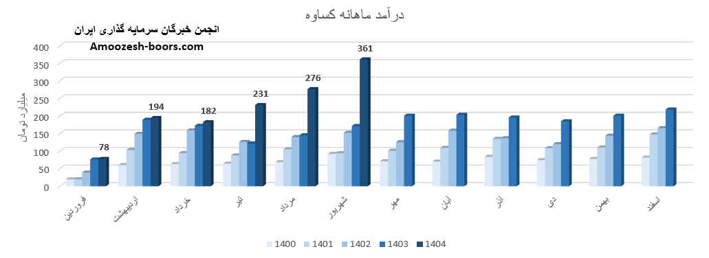 بر اساس گزارش فعالیت سهم کساوه که در کدال منتشر شده، این شرکت در این ماه توانسته به درآمد 361 میلیارد تومان دست یابد، این عدد در مقایسه با ماه گذشته تغییر 31%+، در مقایسه با متوسط ماهانه 88%+ و در مقایسه با مدت مشابه 111%+ داشته است.